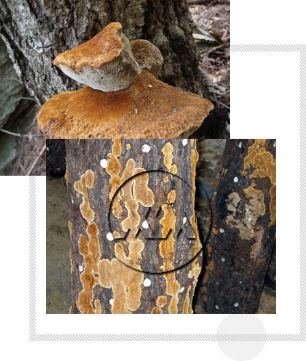 자실체는 선황색으로 다수가 겹쳐서 형성되며, 내부는 흑색의 섬세한 그물코 모양의 대선이 형성된다. 감염된 버섯목은 버섯목화가 지연될 뿐만 아니라 다른 병원균의 발생을 초래한다. 습을 좋아하므로 건조하기 어려운 큰 원목이나 벌채시기가 늦어진 원목 또는 습도가 높은 재배장의 버섯목에 발생하기 쉽다. 원목의 벌채시기가 중요하고, 접종목은 통풍과 배수가 좋은 장소에 쌓아 두어야 한다. 또한 접종 후 뒤집기를 자주 행하여야 한다. 병충해에 의한 피해 없이 고품질의 표고를 수확하기 위해서는 원목의 벌채시기, 건조기간, 종균접종 시기 및 종균접종 전·후 골목의 관리 등 재배현장의 기상조건, 입지조건에 맞추어 정확하게 하는 것 이외에는 다른 방법이 없다. 이들 병해충은 기본적으로 접종 초기 불량한 버섯목에서 부터 시작되므로 접종 전·후 관리가 매우 중요하다. |