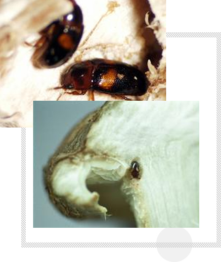 | 3~4월 봄에 나는 표고 자실체의 갓 표면에 산란구멍을 만들어 그 안에 한 알씩 산란하고, 유충은 내부를 불규칙하게 가해한다. 성충은 표고버섯을 섭식 산란한다. 생표고, 건표고 모두 가해한다. 자실체를 갓이 완전히 벌어지기전에 채취하고, 폐골목 및 찌꺼기 버섯을 철저히 제거한다. 병충해에 의한 피해 없이 고품질의 표고를 수확하기 위해서는 원목의 벌채시기, 건조기간, 종균접종 시기 및 종균접종 전·후 골목의 관리 등 재배현장의 기상조건, 입지조건에 맞추어 정확하게 하는 것 이외에는 다른 방법이 없다. 이들 병해충은 기본적으로 접종 초기 불량한 버섯목에서 부터 시작되므로 접종 전·후 관리가 매우 중요하다. 특히 우리나라 여름철 장마기의 기상 환경조건은 고온 다습한 환경으로 표고균이 생장하기에는 상당히 열악한 반면, |